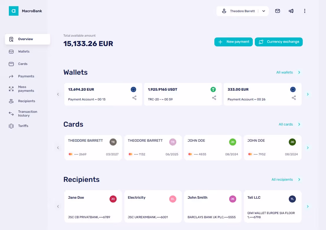 Macrobank is a fully integrated digital core banking platform built for payment institutions, electronic money institutions, and fintech companies. It brings together customer management, multi-rail payment processing, financial accounting, and real-time reconciliation in a single system — so firms can run operations and meet regulatory obligations without managing separate tools.