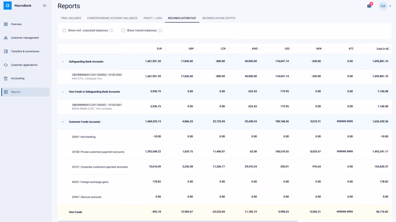 Macrobank is built to meet the FCA’s operational and safeguarding requirements for authorised payment institutions and e-money institutions. The platform’s accounting and reconciliation architecture reflects the FCA’s expectations under the new CASS 15 regime, effective 7 May 2026, supporting the daily internal and external reconciliation obligations, audit trail requirements, and safeguarding separation standards that regulated UK firms must now maintain.